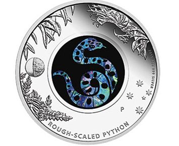 В центре реверса серебряной монеты на опаловой вставке показан питон. На кольце изображены ветки папоротника, созвездие Южный Крест, убывающая Луна. На реверсе указан знак монетного двора – «Р», год чеканки – «2015», технические характеристики – «1oz 999 SILVER». В нижней части монеты выгравирована надпись - «ROUGH-SCALED PYTHON». Дизайнер реверса - Aleysha Howarth.