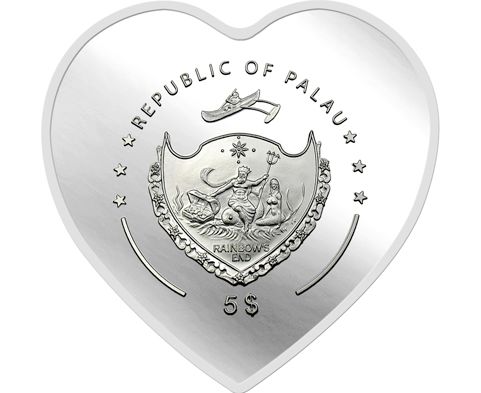 Уникальность монеты определяется многими параметрами. В первую очередь, это форма серебряной монеты в виде сердца. В одно из сердец на аверсе вделана розовая жемчужина. На реверсе монеты изображены Посейдон со своей супругой Амфитритой. Рядом на морскиx волнах раскрытый сундук с сокровищами.
