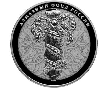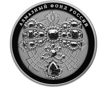в центре диска на фоне элементов традиционного русского орнамента изображение банта-склаважа, вверху вдоль канта – надпись: АЛМАЗНЫЙ ФОНД РОССИИ.