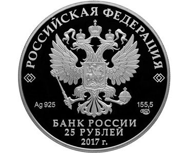 на зеркальном поле диска – рельефное изображение Государственного герба Российской Федерации, над ним вдоль канта – надпись полукругом: РОССИЙСКАЯ ФЕДЕРАЦИЯ, обрамленная с обеих сторон сдвоенными ромбами, внизу под гербом: слева – обозначения драгоценного металла и пробы сплава, справа – содержание химически чистого металла и товарный знак монетного двора, внизу в центре в три строки – надпись: БАНК РОССИИ, номинал монеты: 25 РУБЛЕЙ, год выпуска: 2017 г. .