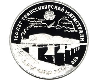 Монета 100 лет Транссибирской магистрали. Мост. 3 рубля 1994 Серебро Россия