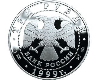 Аверс: в центре диска — эмблема Банка России (двуглавый орёл художника И. Билибина, под ним надпись полукругом «БАНК РОССИИ»), обрамлённая кругом из точек и надписями по кругу: вверху — «ТРИ РУБЛЯ», внизу — «1999 г.», слева — обозначение металла, проба сплава, справа — содержание драгоценного металла в чистоте и товарный знак монетного двора.