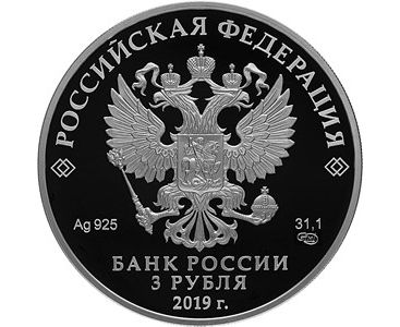 Аверс: на зеркальном поле диска – рельефное изображение Государственного герба Российской Федерации, над ним вдоль канта – надпись полукругом: РОССИЙСКАЯ ФЕДЕРАЦИЯ , обрамленная с обеих сторон сдвоенными ромбами, внизу под гербом: слева – обозначения драгоценного металла и пробы сплава, справа – содержание химически чистого металла и товарный знак монетного двора, внизу в центре в три строки – надпись: БАНК РОССИИ , номинал монеты: 3 РУБЛЯ , год выпуска: 2019 г. .