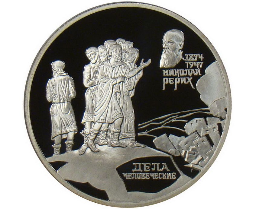 Реверс: фрагмент картины Н.К.Рериха, внизу в две строки — её название: «ДЕЛА ЧЕЛОВЕЧЕСКИЕ», вверху справа — портрет художника, под ним — надпись в две строки: «НИКОЛАЙ РЕРИХ», справа от портрета — даты в две строки «1874 »«1947».