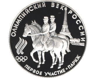 В центре - изображение двух наездников - участников II Олимпийских игр от России на фоне Эйфелевой башни, слева от них - эмблема Российского Олимпийского комитета, по окружности надписи: вверху - ОЛИМПИЙСКИЙ ВЕК РОССИИ , внизу - ПЕРВОЕ УЧАСТИЕ*ПАРИЖ .Олимпийские игры зародились в древней Греции и проводились в Олимпии с 776 г. до н. э. по 394 г. н. э. На время их проведения обязательно объявлялся мир. Современные Олимпийские игры начали проводиться по инициативе барона Пьера де Кубертена (1863-1937), французского общественного деятеля, многолетнего президента Международного олимпийского комитета, созданного в 1894 г. В числе его учредителей был и представитель России - генерал А.Д.Бутовский. Традицию Олимпийских побед русских спортсменов начал Н.А. Панин-Коломенкин (1871-72 - 1956), ставший первым в фигурном катании на коньках на IV Олимпиаде в Лондоне (1908). Впервые в истории Олимпийских игр золотая медаль была завоевана российским спортсменом.