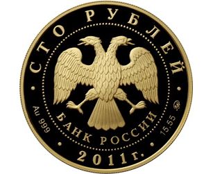 Аверс: в центре диска - эмблема Банка России (двуглавый орел с опущенными крыльями, под ним - надпись полукругом БАНК РОССИИ), обрамленная кругом из точек и надписями по кругу - вверху: СТО РУБЛЕЙ, внизу: слева - обозначения драгоценного металла и пробы сплава, в центре - дата выпуска 2011 г. , справа - содержание химически чистого металла и товарный знак монетного двора.