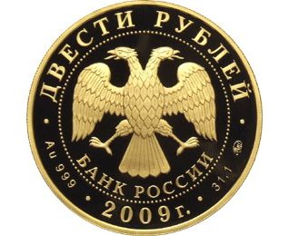Аверс: в центре - эмблема Банка России (двуглавый орёл с опущенными крыльями, под ним - надпись полукругом БАНК РОССИИ ), обрамленная кругом из точек и надписями по кругу - вверху: ДВЕСТИ РУБЛЕЙ , внизу: слева - обозначения драгоценного металла и пробы сплава, в центре - дата выпуска 2009 г. , справа - содержание химически чистого металла и товарный знак монетного двора.
