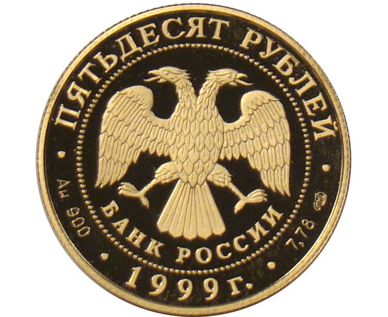Аверс: в центре диска — эмблема Банка России (двуглавый орёл художника И. Билибина, под ним надпись полукругом «БАНК РОССИИ»), обрамлённая кругом из точек и надписями по кругу: вверху — «ПЯТЬДЕСЯТ РУБЛЕЙ», внизу — «1999 г.», слева — обозначение металла, проба сплава, справа — содержание драгоценного металла в чистоте и товарный знак монетного двора.