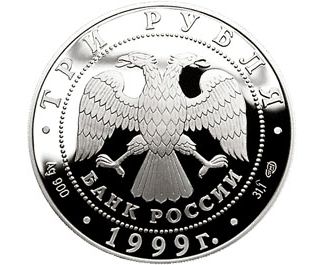 Аверс: в центре диска — эмблема Банка России (двуглавый орёл художника И.Билибина, под ним надпись полукругом «БАНК РОССИИ»), обрамлённая кругом из точек и надписями по кругу:вверху — «ТРИ РУБЛЯ», внизу — «1999 г.», слева — обозначение металла, проба сплава, справа — содержание драгоценного металла в чистоте и товарный знак монетного двора.