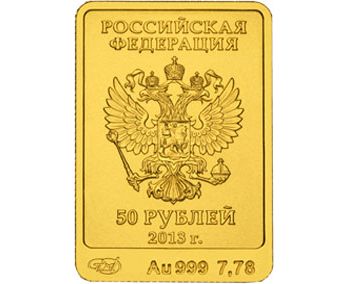 На аверсе расположено рельефное изображение Государственного герба Российской Федерации, имеются надписи: сверху в две строки РОССИЙСКАЯ ФЕДЕРАЦИЯ , внизу номинал монеты- 50 РУБЛЕЙ и год чеканки- 2013г. , обозначение металла по Периодической системе элементов Д.И. Менделее