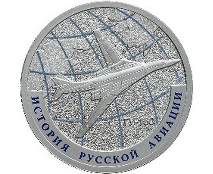 Реверс: в центре диска на сером матовом фоне земного шара - современный реактивный самолет с крылом стреловидной формы, под ним справа - надпись ТУ-160 , внизу на полосе вдоль канта - надпись синего цвета: ИСТОРИЯ РУССКОЙ АВИАЦИИ .
