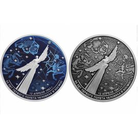 Реверс: в картуше слева - рабочий-металлург в процессе работы, справа - здание главного корпуса бывшего Ижевского оружейного завода, внизу - фрагмент колодки охотничьего ружья с резным орнаментом, за ним - контурное изображение автомата Калашникова, вверху на матированном картуше с орнаментом - восьмиконечный солярный знак и надпись по окружности: УДМУРТИЯ .