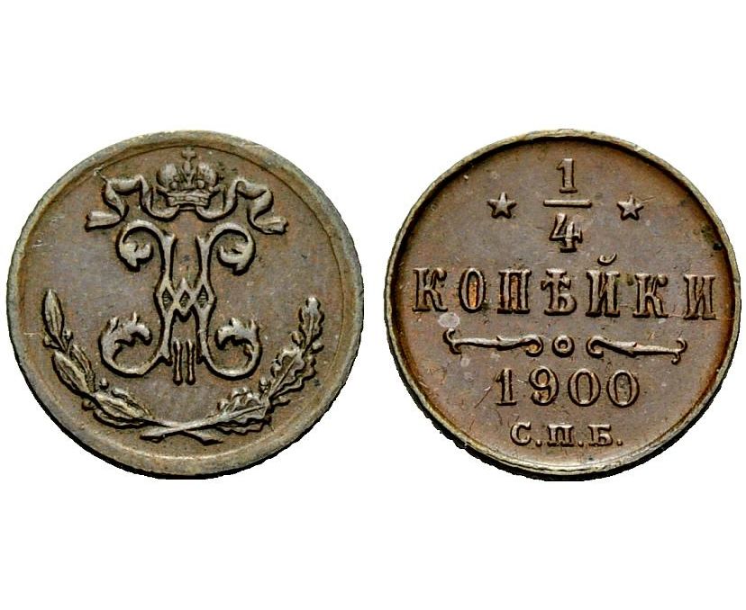 ¼ копейки 1900, Завод Розенкранца в С.Петербурге. 0,77 г. Биткин 311. Практически превосходное.