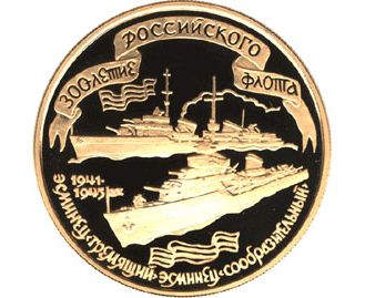 Аверс: изображение двуглавого орла (художник И. Билибин), по кругу надписи: вверху - 100 РУБЛЕЙ 1996 г., внизу - БАНК РОССИИ. В нижней части - обозначение металла, проба сплава, содержание драгоценного металла в чистоте и товарный знак монетного двора. Реверс: изображения эсминцев Гремящий и Сообразительный, слева - дата в две строки: 1941 · 1945, по окружности - надписи: вверху на ленте - 300-ЛЕТИЕ РОССИЙСКОГО ФЛОТА, внизу - ЭСМИНЕЦ <ГРЕМЯЩИЙ> <ЭСМИНЕЦ СООБРАЗИТЕЛЬНЫЙ>. Художник: А.В. Бакланов. Скульптор: Л.С. Камшилов. Чеканка: Московский монетный двор (ММД). Оформление гурта: 240 рифлений. Эскадренный миноносец (эсминец) как класс кораблей появился в начале XX в. Эти боевые корабли, имеющие на вооружении артиллерию, торпеды, ракетное оружие, предназначены для уничтожения подводных лодок и надводных кораблей.