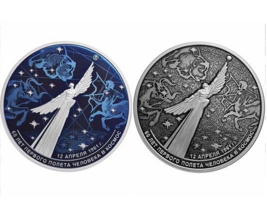 на зеркальном поле диска — рельефные изображения летящей фигуры человека с крыльями и звезды в виде вставки из искусственного камня на фоне выполненных в цвете стилизованных изображений звездного неба и мифологических животных — зодиакальных созвездий Тельца, Льва, Стрельца; внизу вдоль канта — надписи: «12 АПРЕЛЯ 1961 г.», «60 ЛЕТ ПЕРВОГО ПОЛЕТА ЧЕЛОВЕКА В КОСМОС».